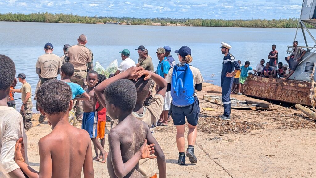 L’étape la plus éprouvante et la plus gratifiante a probablement été l’aide apportée au village de Soalala à Madagascar, à l’ouest de Majunga, touché deux semaines plus tôt par un violent cyclone. Les aspirants se sont réparti les tâches : Hugo à terre pendant trois jours pour prêter main-forte, Adèle à bord pour suivre les opérations de débarquement du fret.